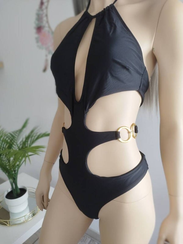 Traje de Baño Entero Negro con Recortes y Aros Dorados🖤🌟